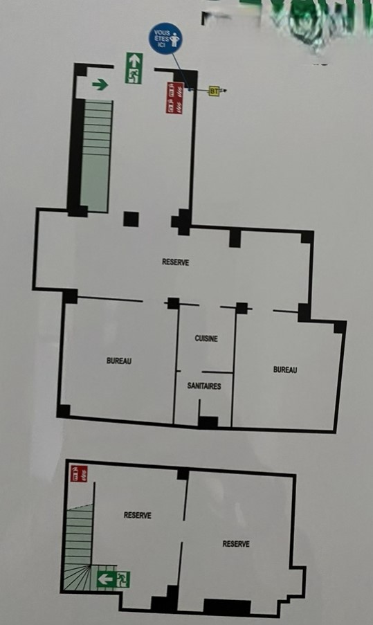 - Réserve de 32,60 m² accessible depuis le local par un escalier (stockage, 1 salle de réunion, salle imprimantes…).