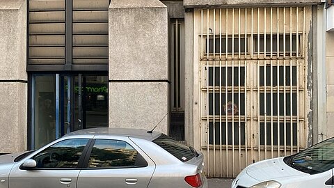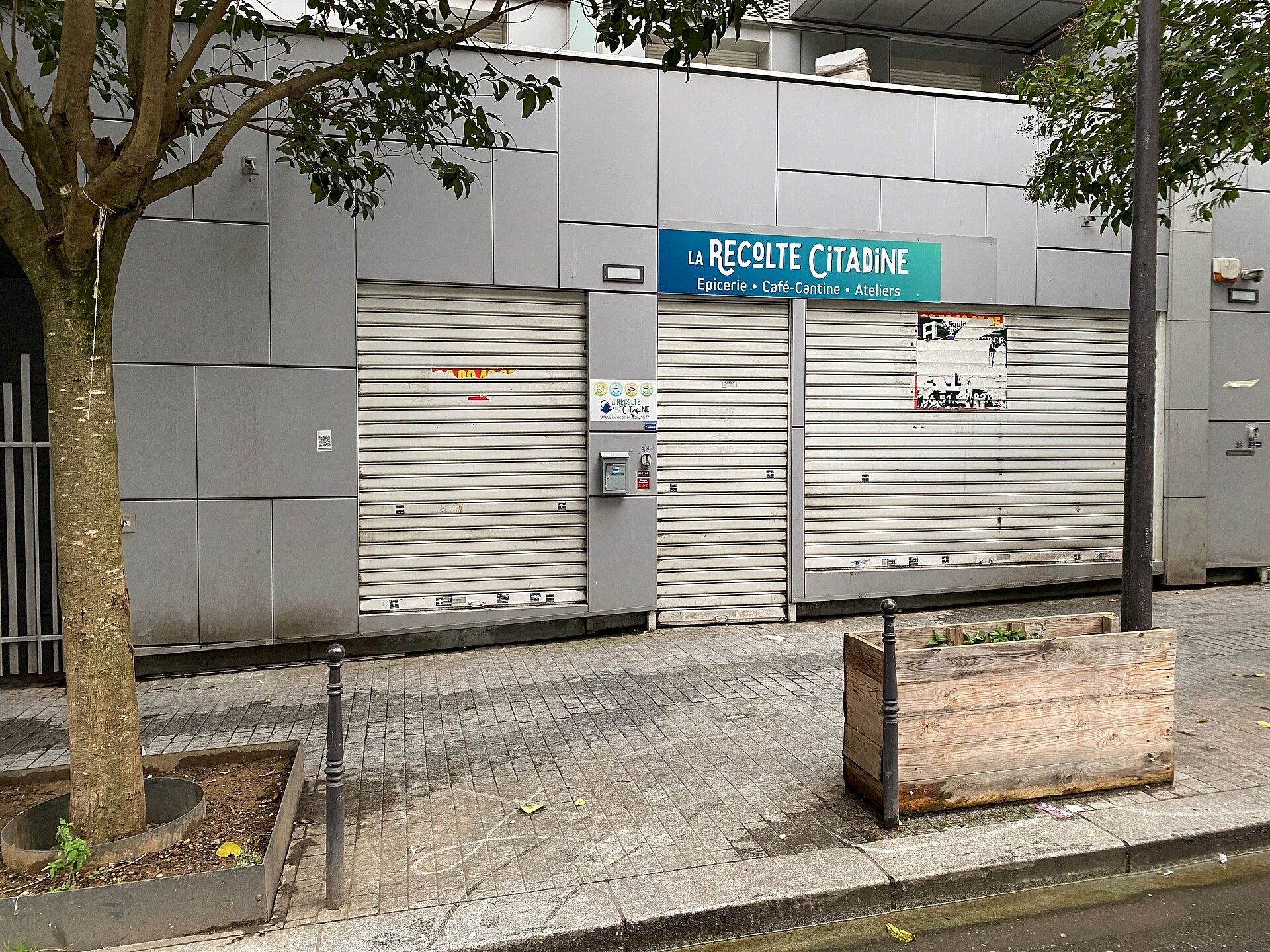 Local avec une large vitrine sécurisée par des rideaux métalliques, bonne visibilité.