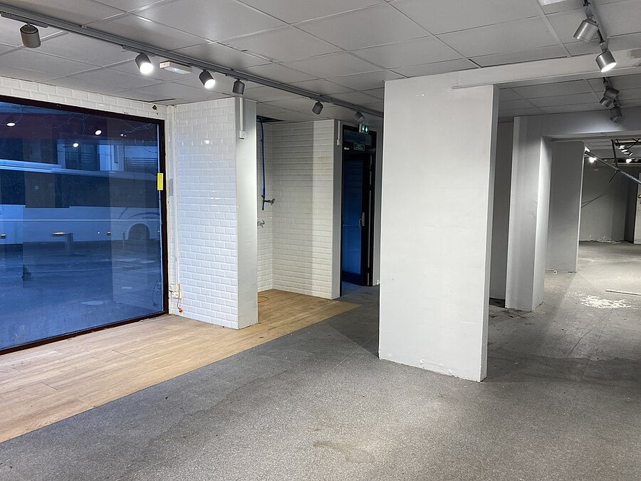 Local commercial avec portes et vitrine sur rue, disposant d'une grande boutique avec un bureau à l'étage et une grande réserve au sous-sol accessible par un escalier intérieur.